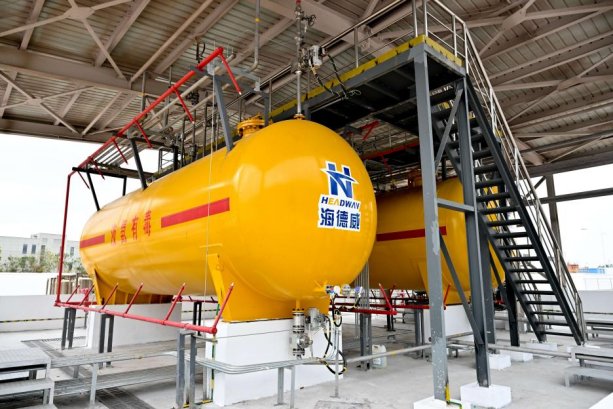 據(jù)悉,海德威此次作為項(xiàng)目總包方,以“交鑰匙”工程模式承擔(dān)了氨燃料供給系統(tǒng)的整體設(shè)計(jì)、核心裝備集成及工程化交付工作,構(gòu)建了覆蓋燃料儲(chǔ)運(yùn)、調(diào)節(jié)控制、安全管理及運(yùn)行支持的完整系統(tǒng)解決方案,提供涵蓋氨燃料儲(chǔ)罐、氨燃料供給模塊、卸車壓縮機(jī)、氨燃料輸送泵、氨氣相處理系統(tǒng)、可燃?xì)怏w探測(cè)及雙壁管在內(nèi)的整套全流程定制化解決方案。作為面向?qū)嵈瑧?yīng)用的重要平臺(tái)型項(xiàng)目,該測(cè)試平臺(tái)嚴(yán)格按照船用產(chǎn)品標(biāo)準(zhǔn)設(shè)計(jì)建造并滿足陸地驗(yàn)收要求,海德威在其中的角色不是單一配套商,而是圍繞平臺(tái)運(yùn)行目標(biāo)進(jìn)行系統(tǒng)拆解、接口統(tǒng)籌、模塊集成和工程交付的組織者。